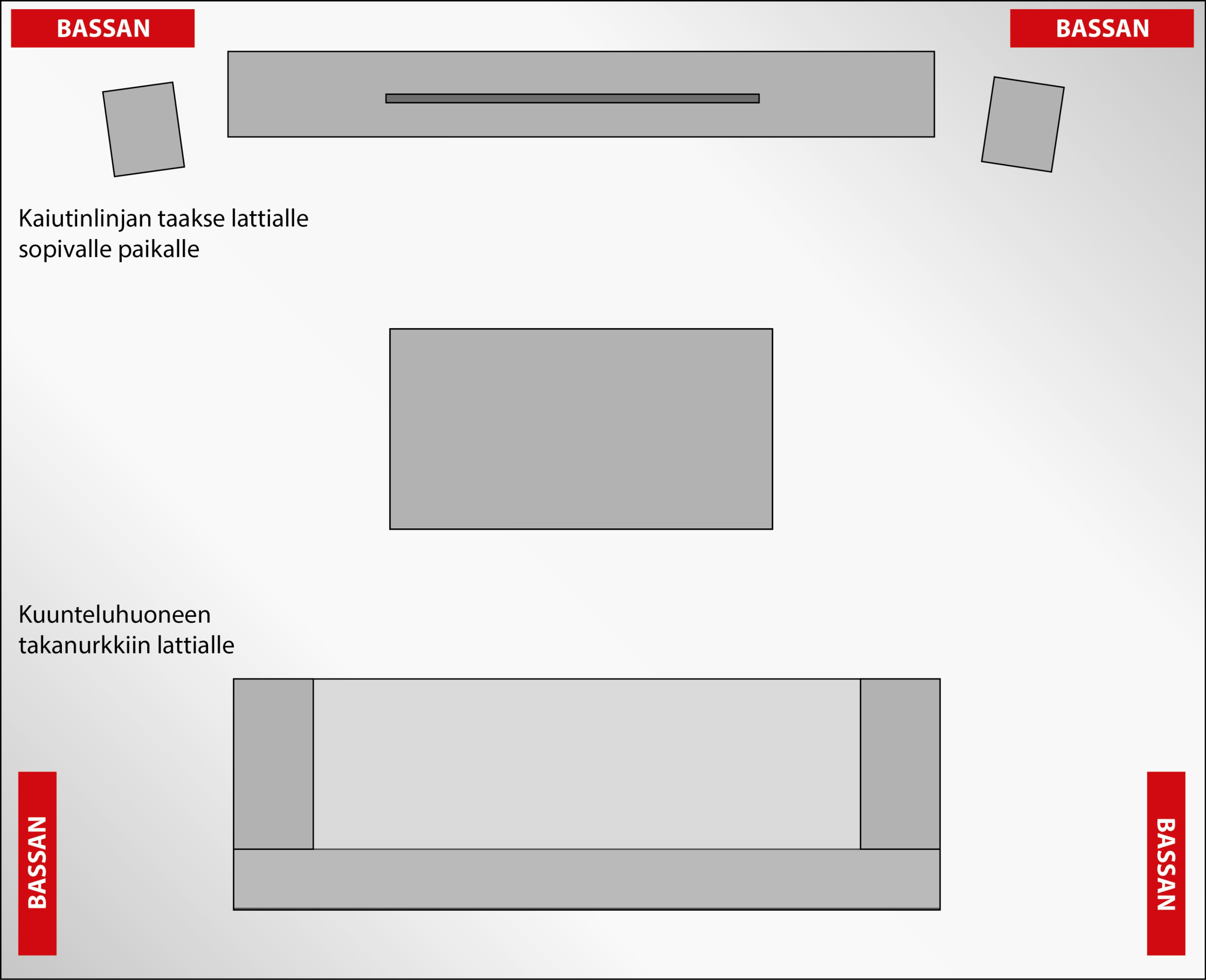 Puhelimien sovelluskaupoista löytyy äänigeneraattoreita, joilla voit kuunnella 60 tai 120 hz taajuutta ja samalla liikkua huoneessa ja seurata tajuuden voimakkuuden vaihtelua eri puolella kuuntelutilaa. Mikäli et luota omiin korviisi, niin voit käyttää apunasi puhelimen mikrofonia ja desibelimittarisovellusta. Kohta missä ääni on voimakkaimmillaan, niin sieltä löytyy yleensä BASSAN:n oikea paikka.